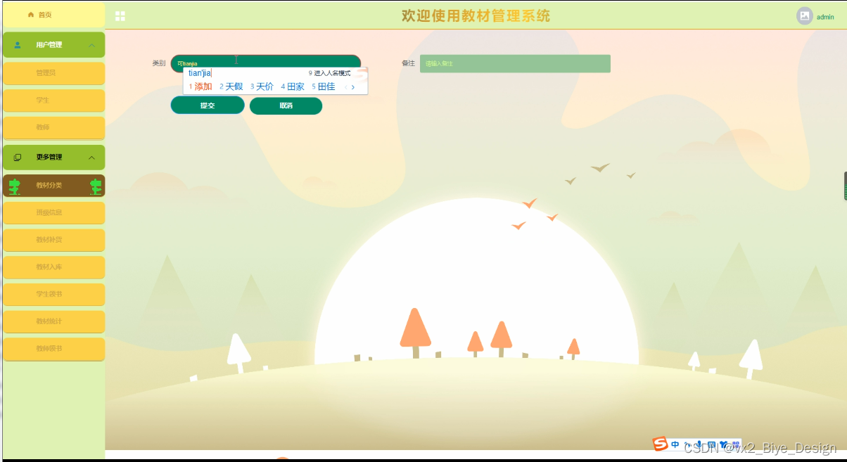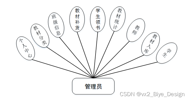 管理员功能模块包括:教材分类、班级信息、教材补货、学生领书、教材统计、教师领书等。
