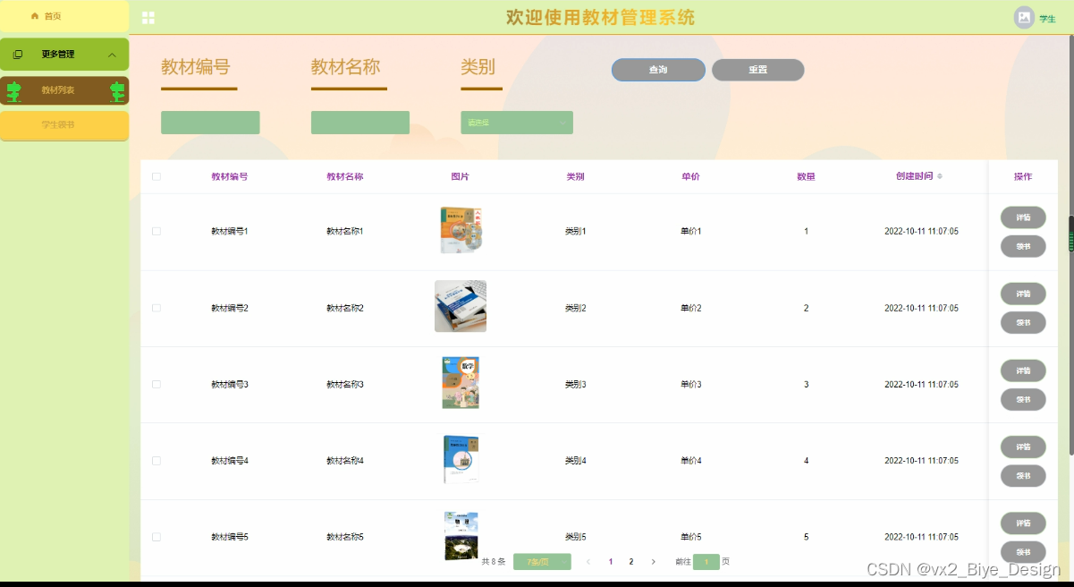 更多管理中,在教材分类中,可对书籍信息进行查询、重置、删除、添加等信息进行操作;如图5-13所示。