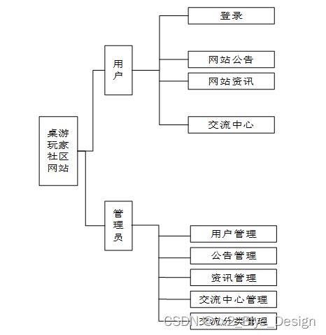 桌游玩家社区网站中,用户可以在线进行交流中心互动等,其模块功能结构,具体的结构图如下: