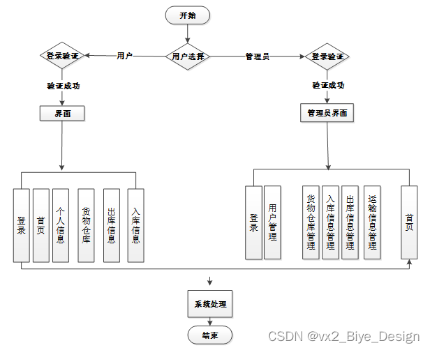 本系统主要包含了、登录模块的实现、用户管理模块、货物仓库模块、入库信息模块、出库信息模块、运输信息模块等多个功能模块。下面分别简单阐述一下这几个功能模块需求。不同的权限对应相应的功能模块的需求,管理员权限的级别是最高的,所以所对应的需求是最多的,根据不同的权限分别简单阐述一下各个权限的需求。