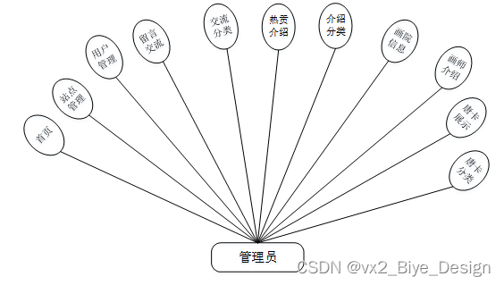 系统中的核心用户是系统管理员,管理员登录后,通过管理员菜单来管理后台系统。主要功能有:首页、站点管理(轮播图、公告栏)、用户管理(管理员、注册用户)、内容管理(留言交流、交流分类、热贡介绍、介绍分类)、更多管理(画院信息、画师介绍、唐卡展示、唐卡分类)等功能。管理员端用例如图3-7所示。
