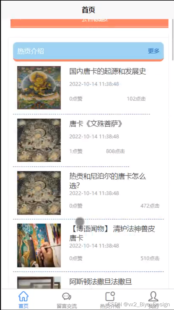 用户登录进入系统首页可以查看首页、留言交流、热贡介绍、我的等功能模块,并可对功能模块进行相应操作,如图5-2所示。