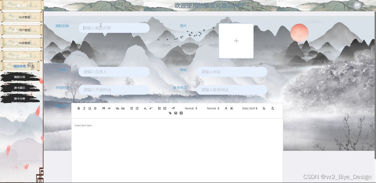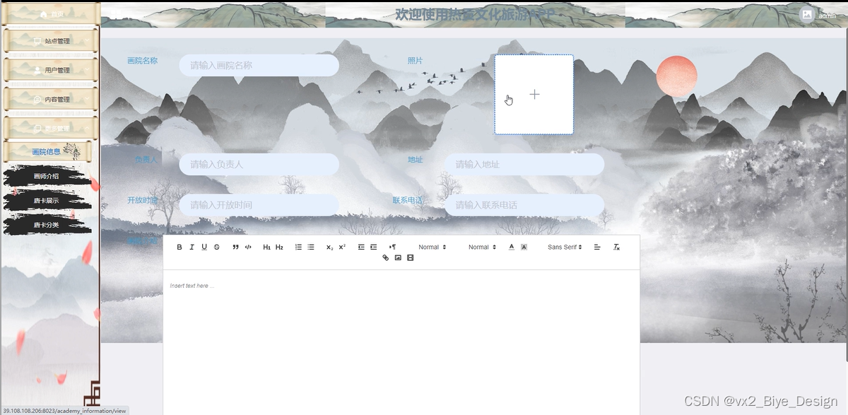 画院信息管理,在画院信息管理页面可以对画院名称、照片、负责人、地址、开放时间、联系电话、画院介绍等进行详情、添加、查询或删除等操作,如图5-11所示。