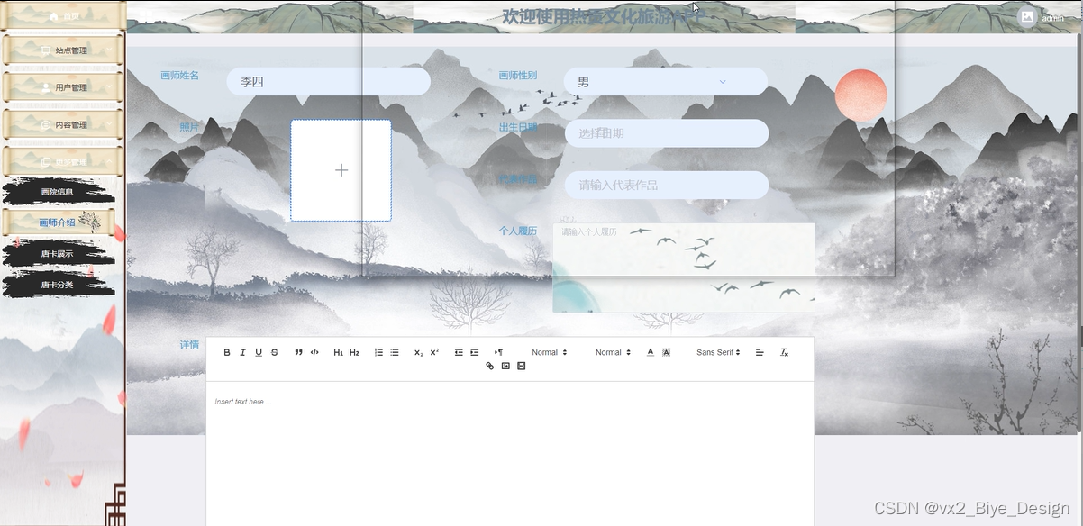 画师介绍管理,在画师介绍管理页面可以对画师姓名、画师性别、照片、出生日期、个人履历、代表作品、等进行详情、添加、查询或删除等操作,如图5-12所示。