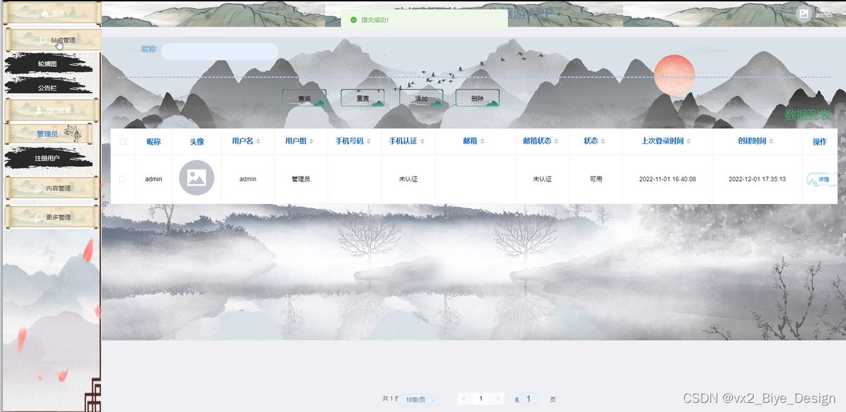 管理员登陆系统后,可以对首页、站点管理(轮播图、公告栏)、用户管理(管理员、注册用户)、内容管理(留言交流、交流分类、热贡介绍、介绍分类)、更多管理(画院信息、画师介绍、唐卡展示、唐卡分类)等功能模块进行相应等操作,如图5-8所示。