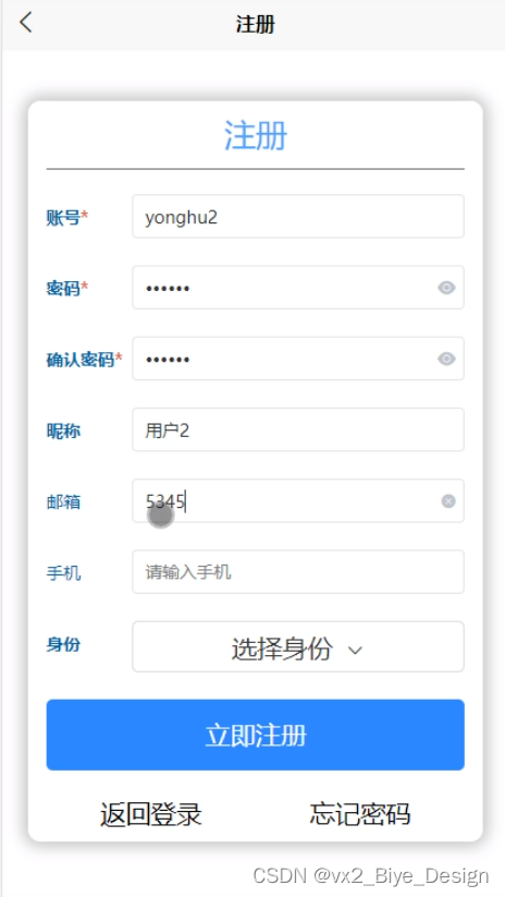 用户注册,在用户注册页面通过填写账号、密码、确认密码、昵称、身份、手机、邮箱、用户编号等内容完成用户注册,如图5-6所示。