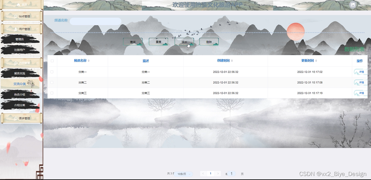 交流分类管理,在交流分类管理页面可以对索引、频道名称、描述等进行详情、添加或删除等操作,如图5-10所示。
