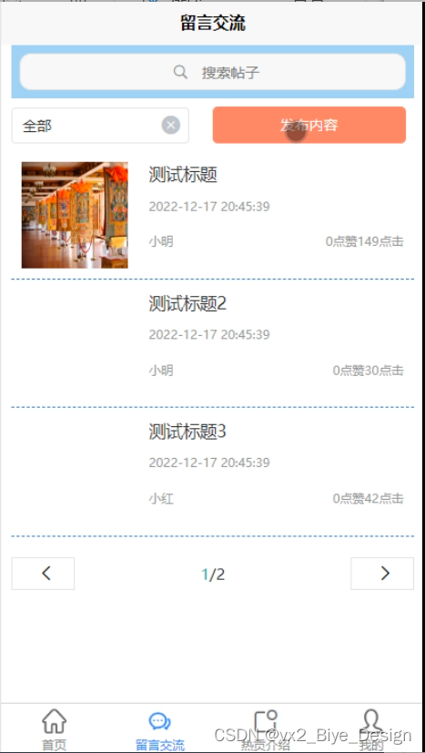 留言交流,在留言交流页面可以查看封面图、标题、分类、标签、描述、点赞、收藏、点击率、文章点评等操作,如图5-4所示。