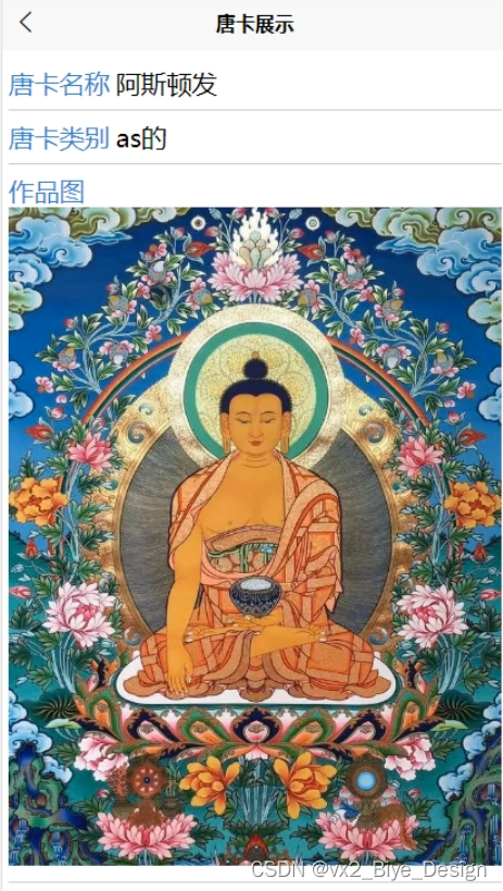 唐卡展示,在唐卡展示页面可以查看唐卡名称、唐卡类别、作品图、画师姓名、出品时间、作品含义、绘制过程、详情、点赞、点击数、评论区等信息操作,如图5-3所示。