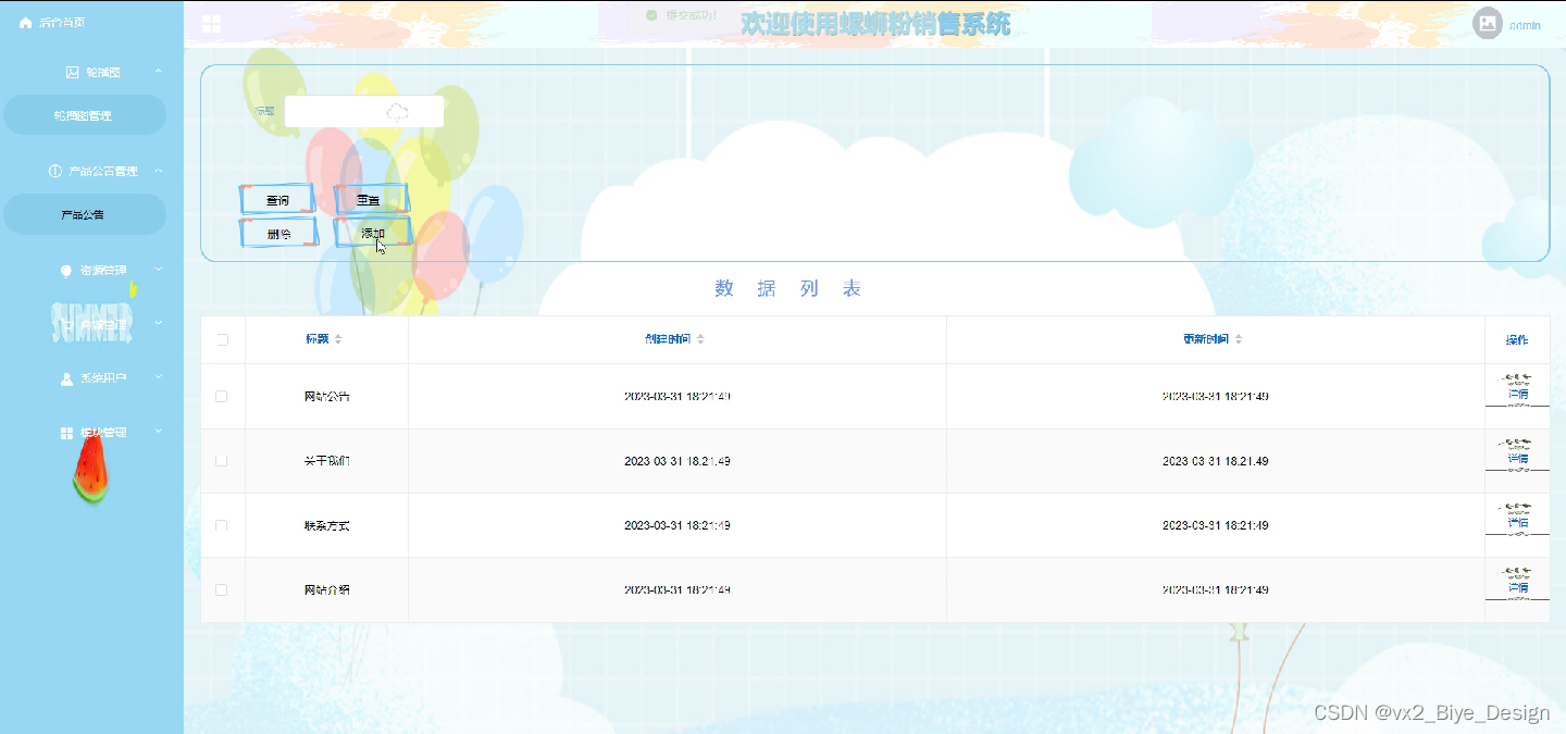 产品公告管理,在产品公告管理页面中可以对索引、标题、正文、创建时间、更新时间等信息进行详情、修改、添加或删除等操作,如图5-6所示。