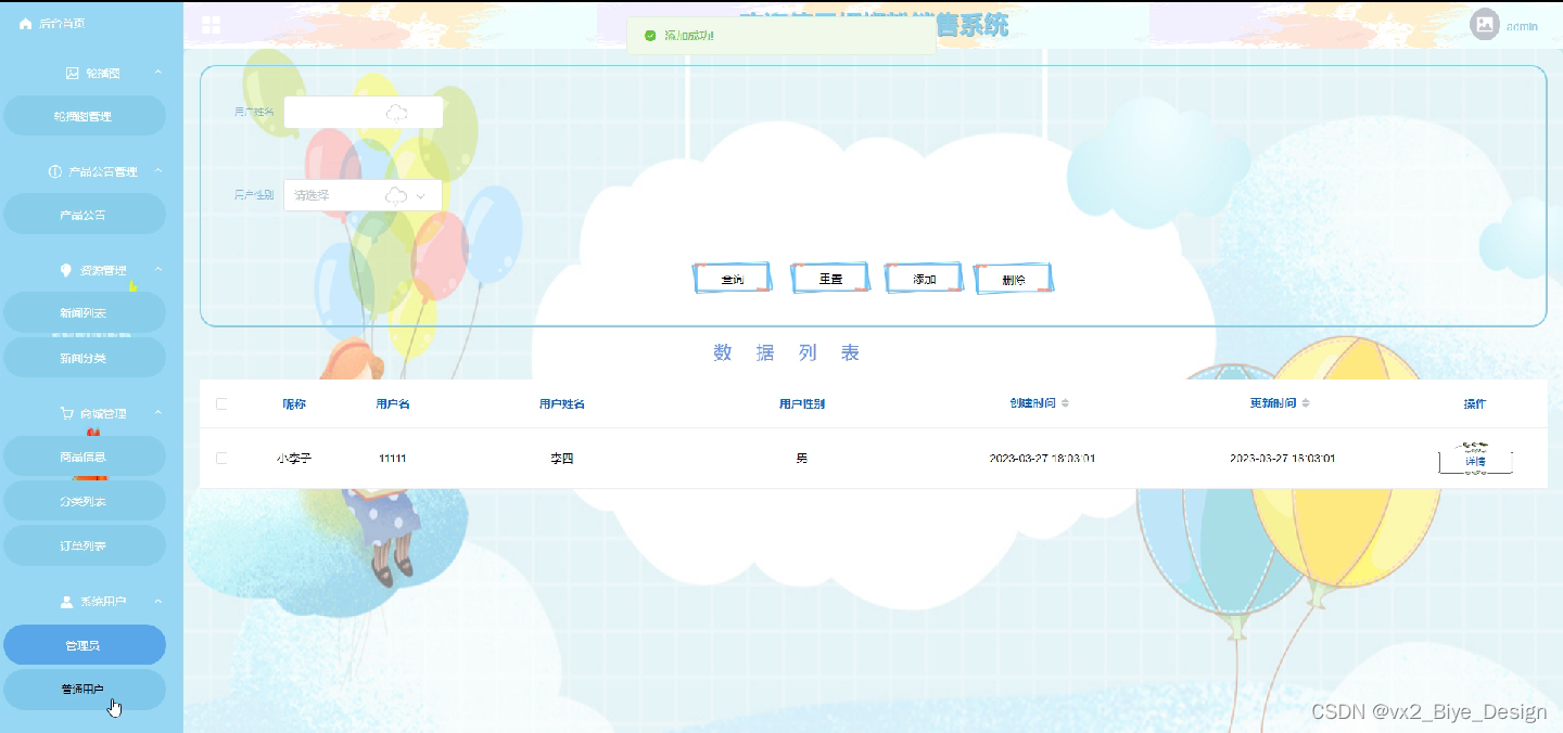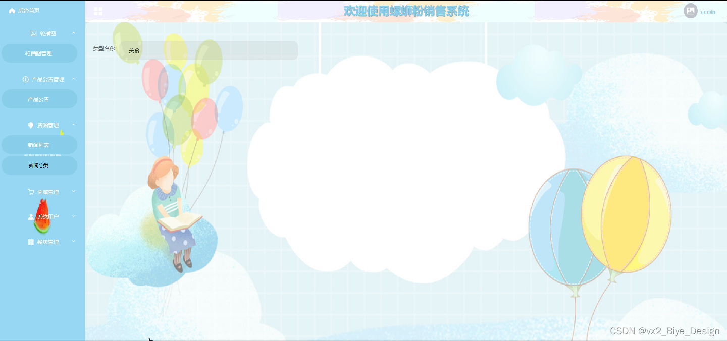 管理员登录进入螺丝粉销售系统之后,就可以对所有的信息进行查看,可以查看到后台首页、轮播图、产品公告、资源管理(新闻列表、新闻分类)系统用户(管理员、普通用户)、商城管理(商品信息、分类列表、订单列表)模块管理(留言板)、个人信息等,并且还可以对其进行相应的操作管理,如图5-2所示。