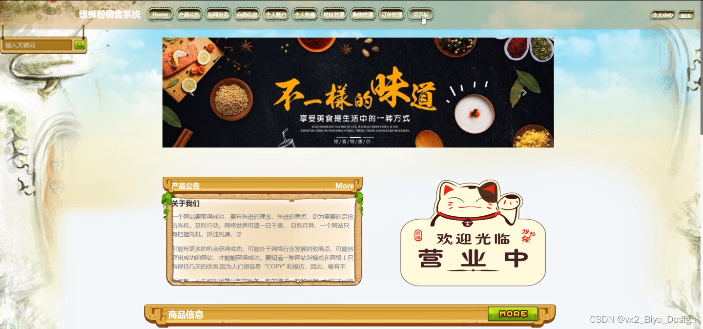 用户登录进入螺丝粉销售系统可以对首页、个人中心、产品公告、新闻资讯、商品信息、地址管理、订单管理、购物管理、个人账户、个人收藏、留言板等进行相应的操作管理,如图5-9所示。