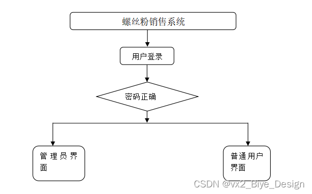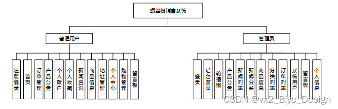(3)确定好系统使用的技术,进行在线确认系统所划分的用户角色,并且根据用户角色划分确定所要设计的功能模块,对螺丝粉销售系统的设计主要划分别为管理员和用户角色,并所使用的功能模块也相应不同,但是系统的数据库实现的内容是交互的,用户可以随时根据自己的需求进行信息查询,对于系统工作人员可以根据自己的分管内容进行在线信息的处理及操作,管理员获取到所有用户的详细数据信息,并根据需求进行第一时间处理解决。