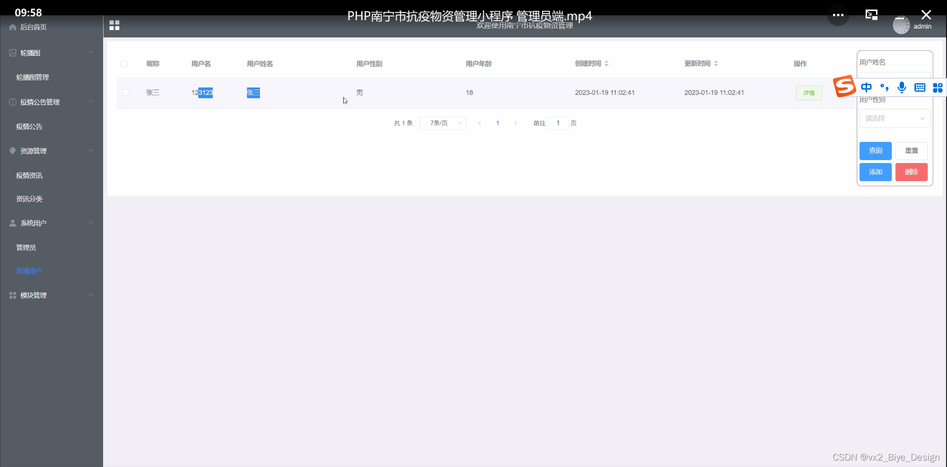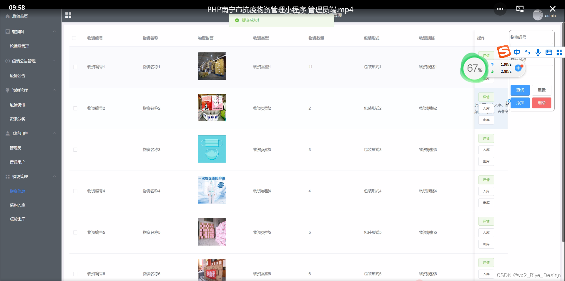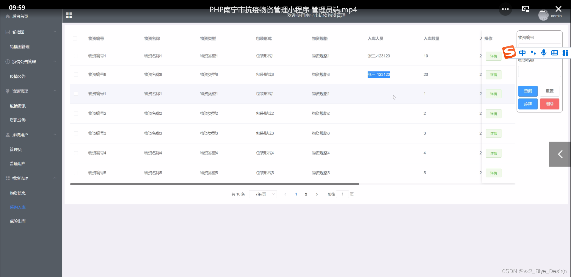 在管理员功能页面可以查看首页、轮播图、疫情公告、资源管理(疫情资讯、资讯分类)系统用户(管理员、普通用户)模块管理(物资信息、采购入库、点验出库)等内容进行相对应操作,如图5-10所示。