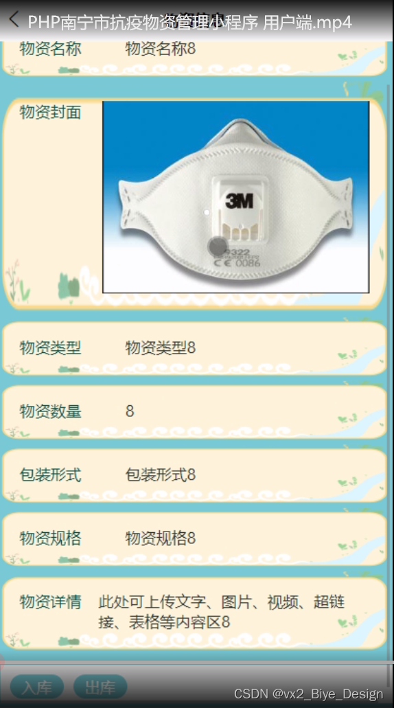 物资信息,在物资信息页面可以填写物资名称、物资封面、物资类型、物资数量、包装形式、物资规格、物资详情等信息,并可根据需要入库或者出库。如图5-5所示。