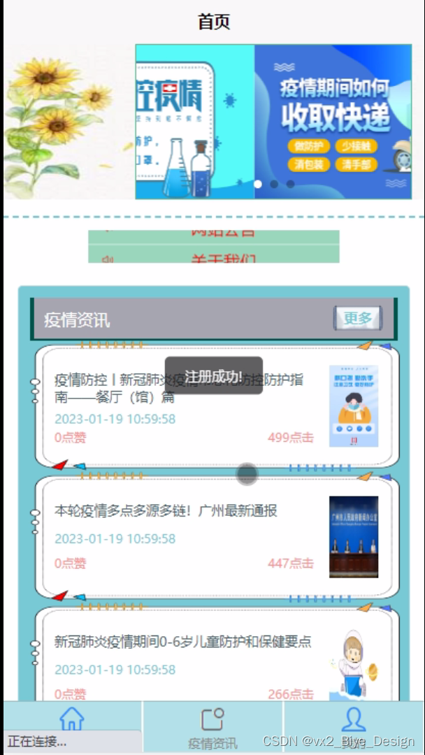 疫情资讯,在疫情资讯页面可以查看标题、资讯内容、封面等信息,并可对资讯进行点赞、收藏等操作。如图5-4所示。