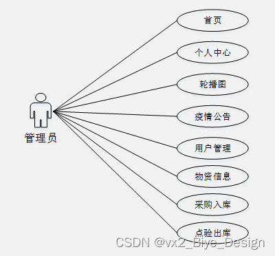 (3)确定好系统使用的技术,进行在线确认系统所划分的用户角色,并且根据用户角色划分确定所要设计的功能模块,对于南宁市抗疫物资管理小程序系统的设计主要划分别为管理员和用户角色,并所使用的功能模块也相应不同,但是系统的数据库实现的内容是交互的,用户可以随时根据自己的需求进行课程信息,对于系统工作人员可以根据自己的分管内容进行在线信息的处理及操作,管理员获取到所有用户的详细数据信息,并根据需求进行第一时间处理解决。