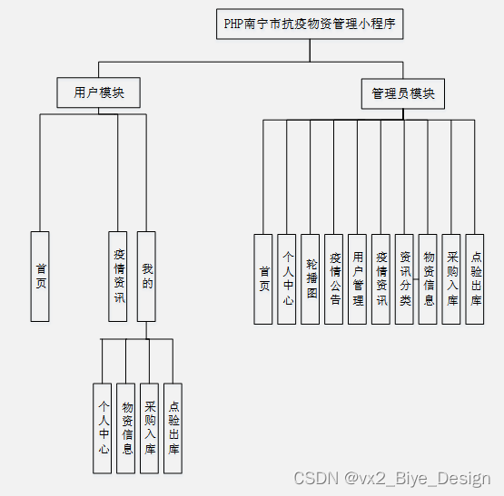 基于南宁市抗疫物资管理小程序的设计基于现有的手机,可以实现首页、轮播图、疫情公告、资源管理(疫情资讯、资讯分类)系统用户(管理员、普通用户)模块管理(物资信息、采购入库、点验出库)等功能。方便用户对首页、疫情资讯、我的(个人中心、采购入库、点验出库)等详细的了解及统计分析。根据系统功能需求建立的模块关系图如下图: