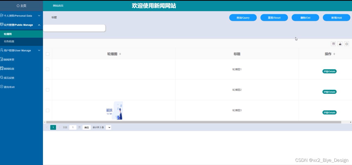 轮播图管理,在此页面可以查看轮播图封面图,标题等信息,并可根据需要进行查询,重置,删除,新增等操作,如图5-3所示。