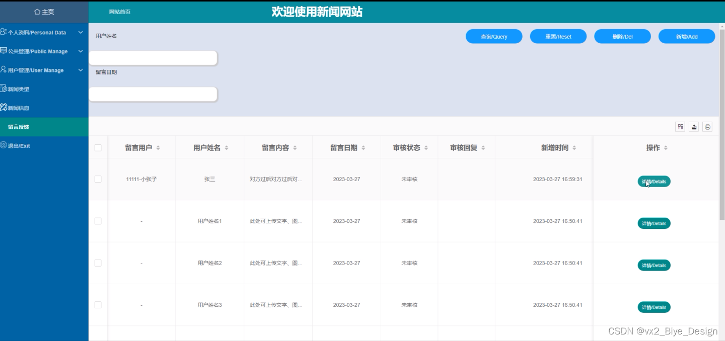 留言反馈管理,管理员在此页面可以查看留言用户,用户姓名,留言内容,审核状态,审核回复等信息,并可根据需要进行审核回复,查询,重置,删除,新增等操作,如图5-10,5-11所示。