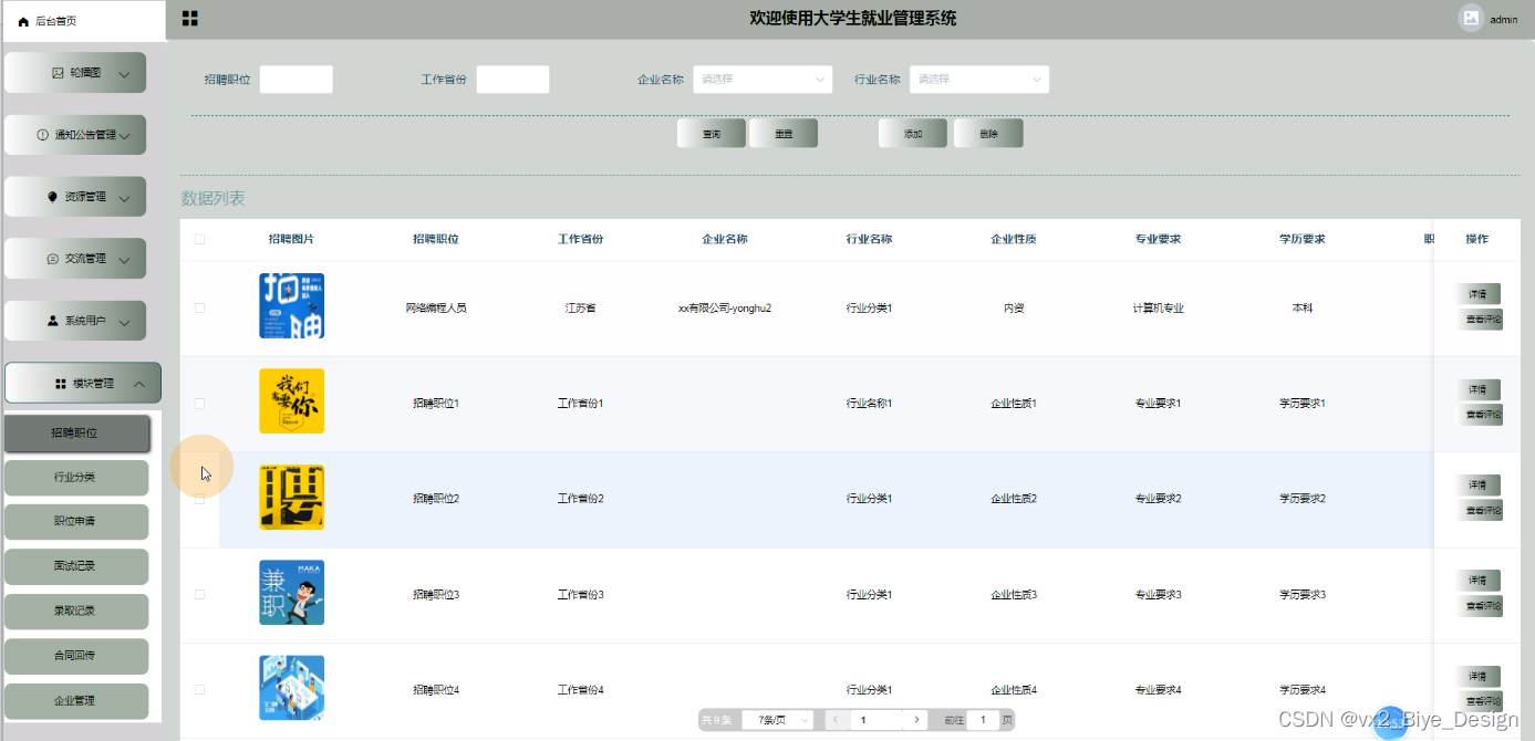 大学生就业管理系统主要功能模块包括系统首页、轮播图(轮播图管理)、通知公告管理(通知公告)、资源管理(就业资讯、资讯分类)、交流管理(留言墙、留言分类)、系统用户(管理员、学生用户、教师用户、企业用户)、模块管理(招聘职位、行业分类、职位申请、面试记录、录取记录、合同回传、企业管理),采取面对对象的开发模式进行软件的开发和硬体的架设,能很好的满足实际使用的需求,完善了对应的软体架设以及程序编码的工作,采取MySQL作为后台数据的主要存储单元,采用springboot框架、java技术、Ajax技术进行业务系统的编码及其开发,实现了本系统的全部功能。本次报告,首先分析了研究的背景、作用、意义,为研究工作的合理性打下了基础。针对大学生就业管理系统的各项需求以及技术问题进行分析,证明了系统的必要性和技术可行性,然后对设计系统需要使用的技术软件以及设计思想做了基本的介绍,最后来实现大学生就业管理系统和部署运行使用它。