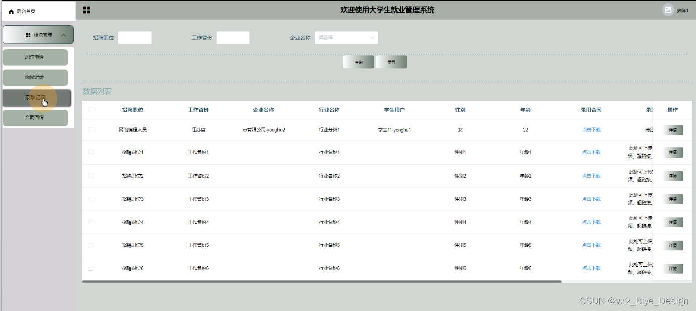 录取记录管理,录取记录管理页面中可以查看招聘职位、工作省份、企业名称、行业名称、学生用户、性别、年龄、录用合同等信息,进行相对应操作,如图5-13所示。