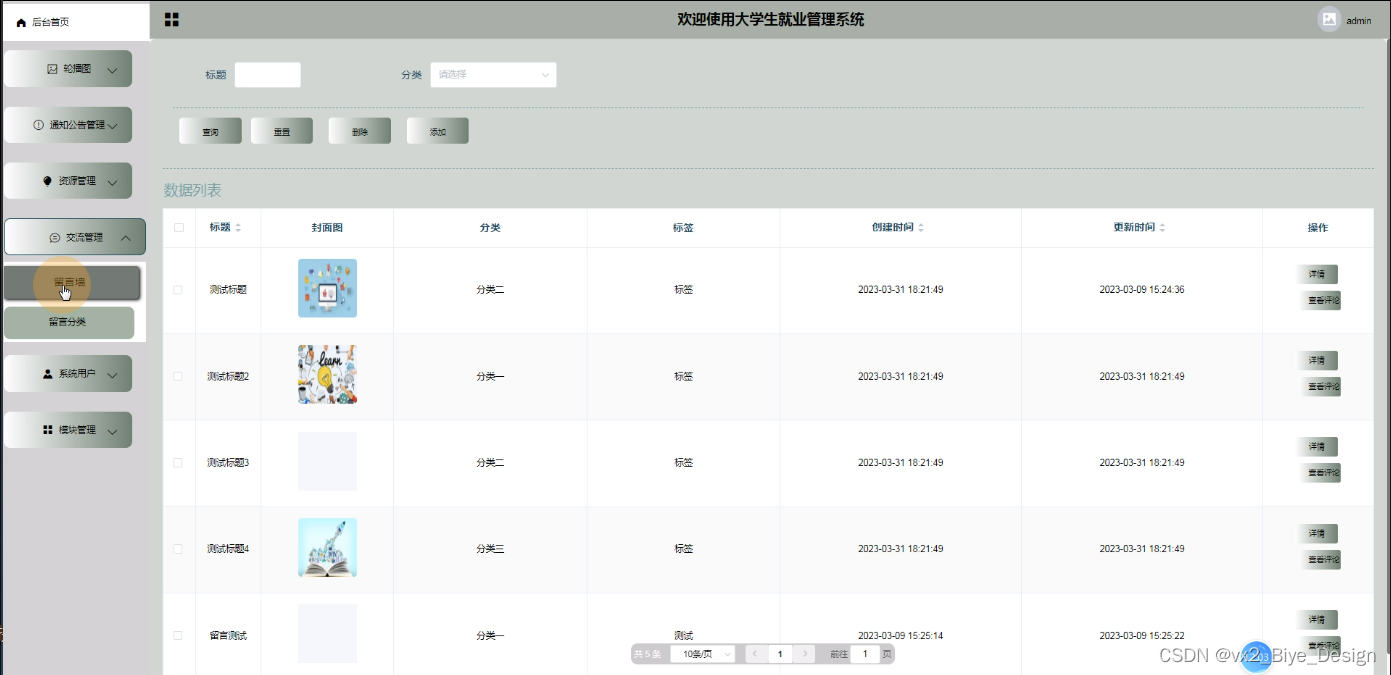留言墙管理,在留言墙管理页面中可以查看索引、标题、封面图、分类、标签等信息,并可根据需要进行查看评论、修改或删除等操作,如图5-9所示。