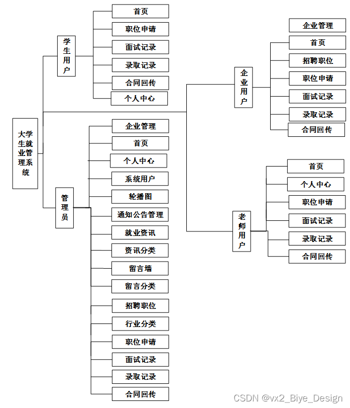 大学生就业管理系统总体分为前学生模块、企业模块、教师模块和管理员模块。