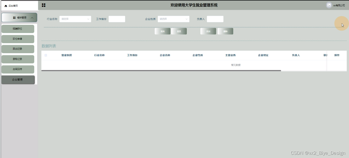 企业登录进入大学生就业管理系统可以查看首页、模块管理(招聘职位、职位申请、面试记录、录取记录、合同回传、企业管理)等内容。如图5-14所示。