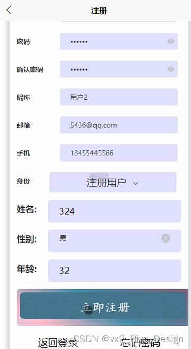 | 预计输出数据 | 1、用户能正确注册账号,成功插入数据库用户的账户资料,提示注册成功。 2、无法注册用户信息,注册失败。 3、无法注册用户信息,注册失败。 |