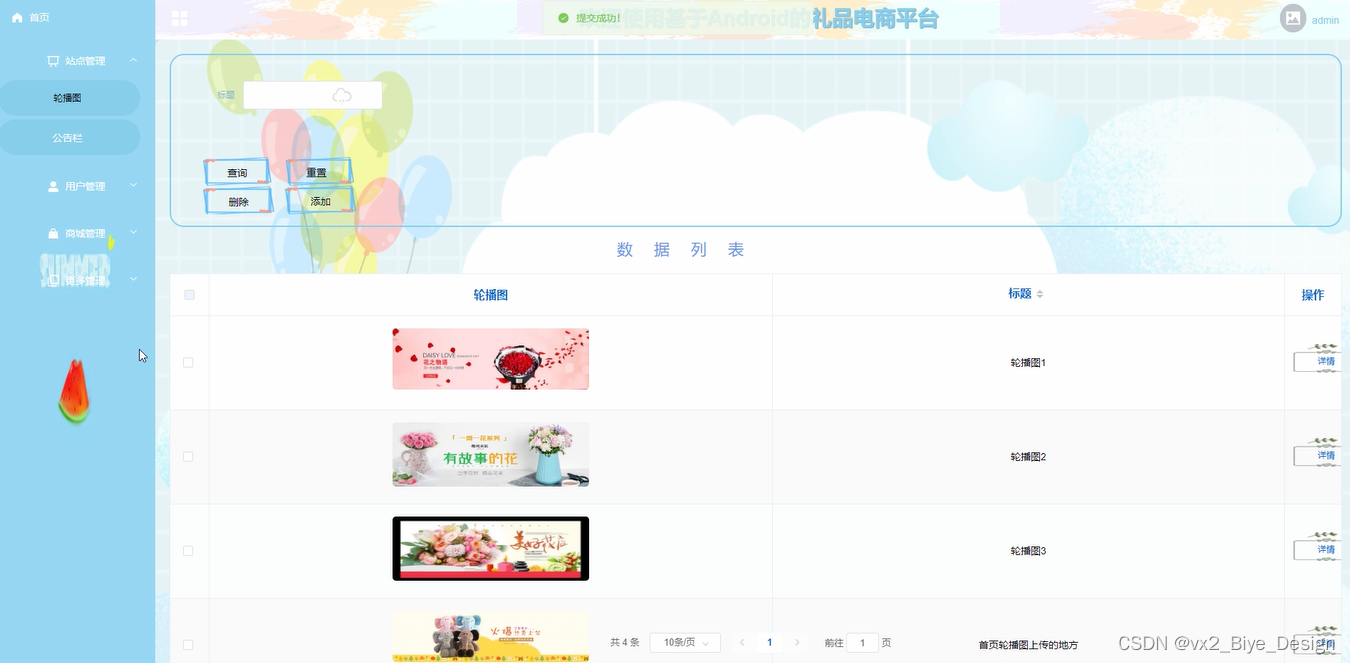 用户在系统前台浏览轮播图、公告,管理员登录系统后,可以添加、删除、修改操作。