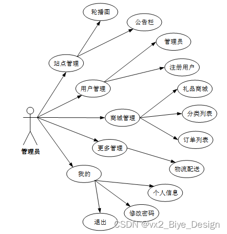 1.管理员主要负责站点管理、用户管理、商城管理(礼品商城、分类列表、订单列表)、更多管理(物流配送),下图所示描述管理员的用例。