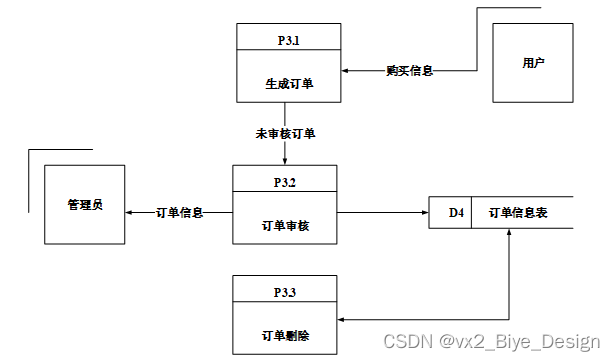 将订单信息管理进行细化得到订单信息管理二层数据流程图,如下图所示。