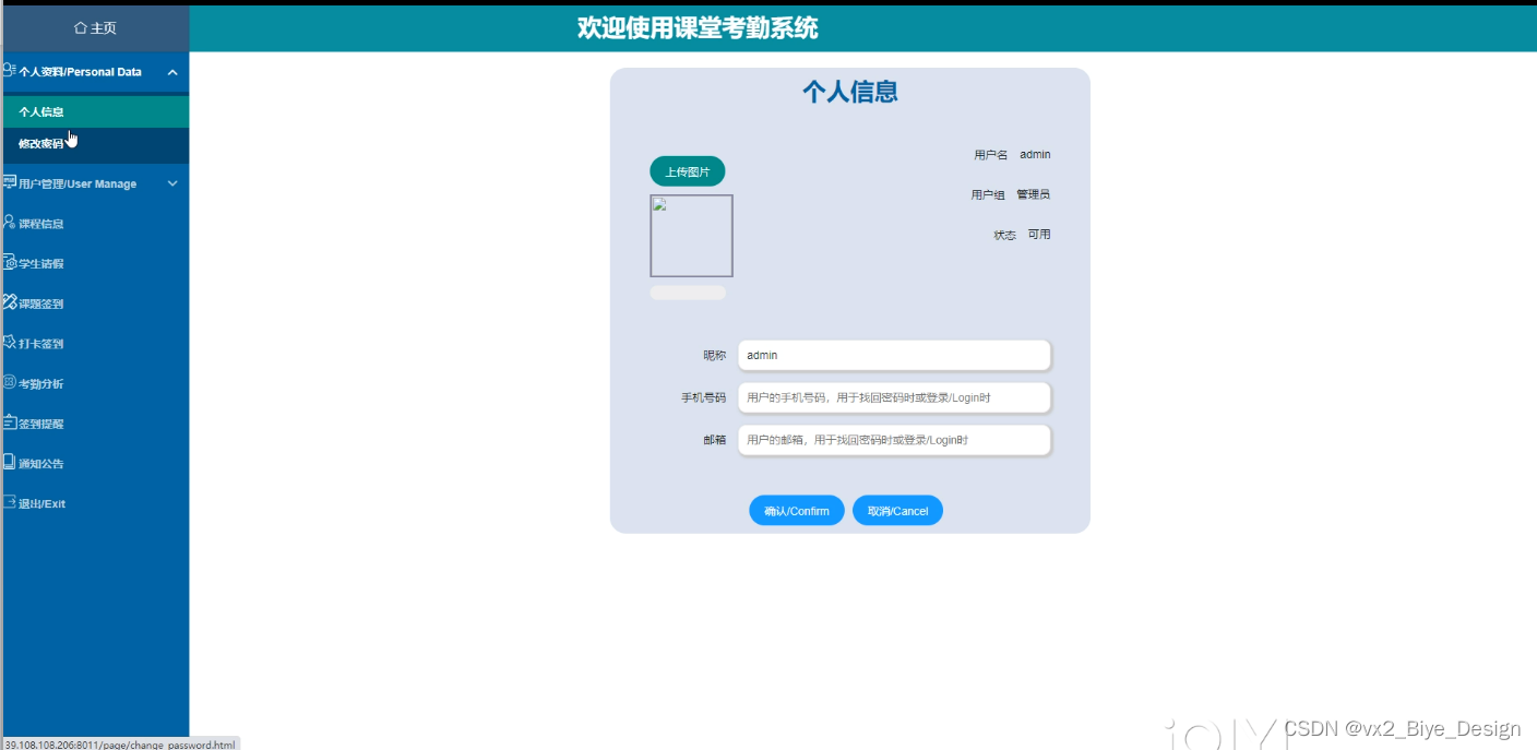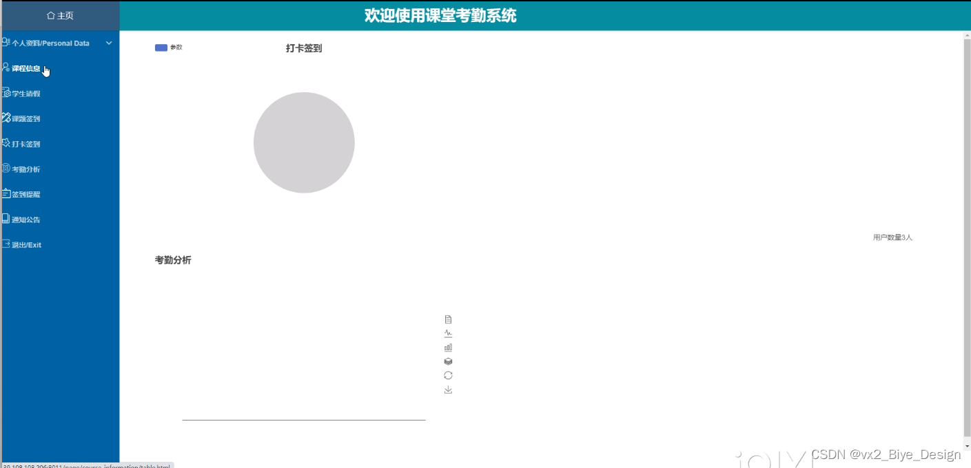 管理员登录进入课堂考勤系统可以查看首页、个人资料(个人信息、修改密码)、用户管理(管理员、教师用户、学生用户)、课程信息、学生请假、课题签到、打卡签到、考勤分析、签到提醒、通知公告等信息,如图5-2所示。