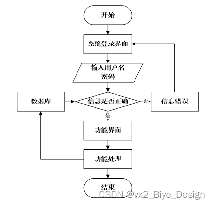 用户打开并进入系统后,会先显示登录界面,输入正确的用户名和密码,系统自动检测信息,若信息无误,则用户会进入系统功能界面,进行操作,否则会提示错误无法登录,操作流程如图3-3所示。