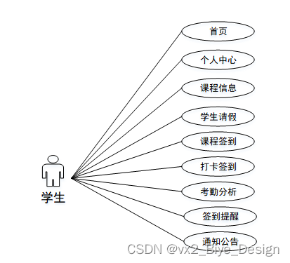 学生进入系统可以进行首页、个人资料(个人信息、修改密码)、课程信息、学生请假、课题签到、打卡签到、考勤分析、签到提醒、通知公告管理等。学生用例如图3-8所示。