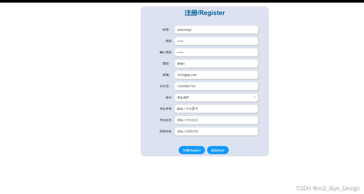 通过学生注册可以填写账号、密码、昵称、邮箱、身份、手机号、学生学号、学生姓名、班级名称等内容,如图5-10所示。
