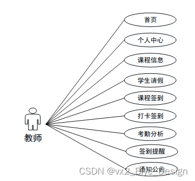 教师进入系统可以进行首页、个人资料(个人信息、修改密码)、课程信息、学生请假、课题签到、打卡签到、考勤分析、签到提醒、通知公告管理等。教师用例如图3-9所示。