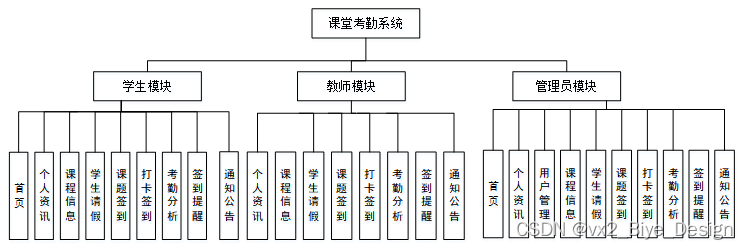 系统架构图属于系统设计阶段,系统架构图只是这个阶段一个产物,系统的总体架构决定了整个系统的模式,是系统的基础。课堂考勤系统的整体结构设计如图4-2所示。