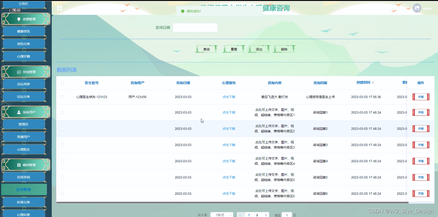 This design mainly implements a small program for college students' mental health consultation that integrates the advantages of humanization, efficiency, and convenience, and completes functional modules such as online consultation, consultation management, science popularization classification, and psychological science popularization. The system communicates with the server through a browser to achieve data interaction and change. This system improves work efficiency and reduces errors and omissions in data storage through scientific management methods and convenient services. The college students' mental health consultation applet uses Java language, uses spring boot technology based on MVVM mode for development, and uses Eclipse 2017 CI 10 compiler to write it. In terms of data, it mainly uses Microsoft's MySQL database as the data storage medium, and cooperates with front-end HTML+CSS technology to complete the system development.