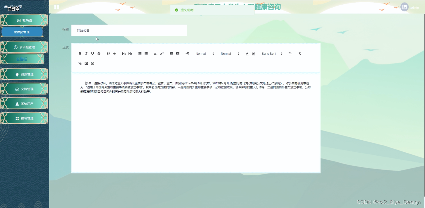 | 用例描述 | 管理员正确登录后台管理的条件下,对咨询模块进行管理 |