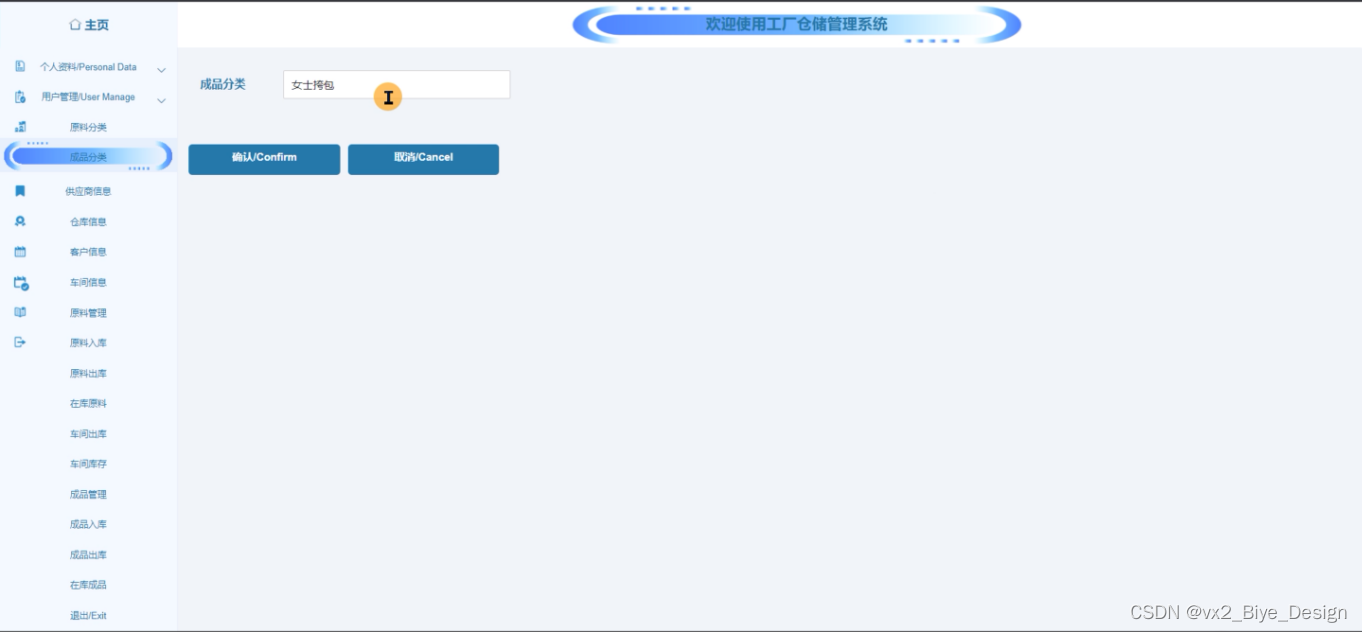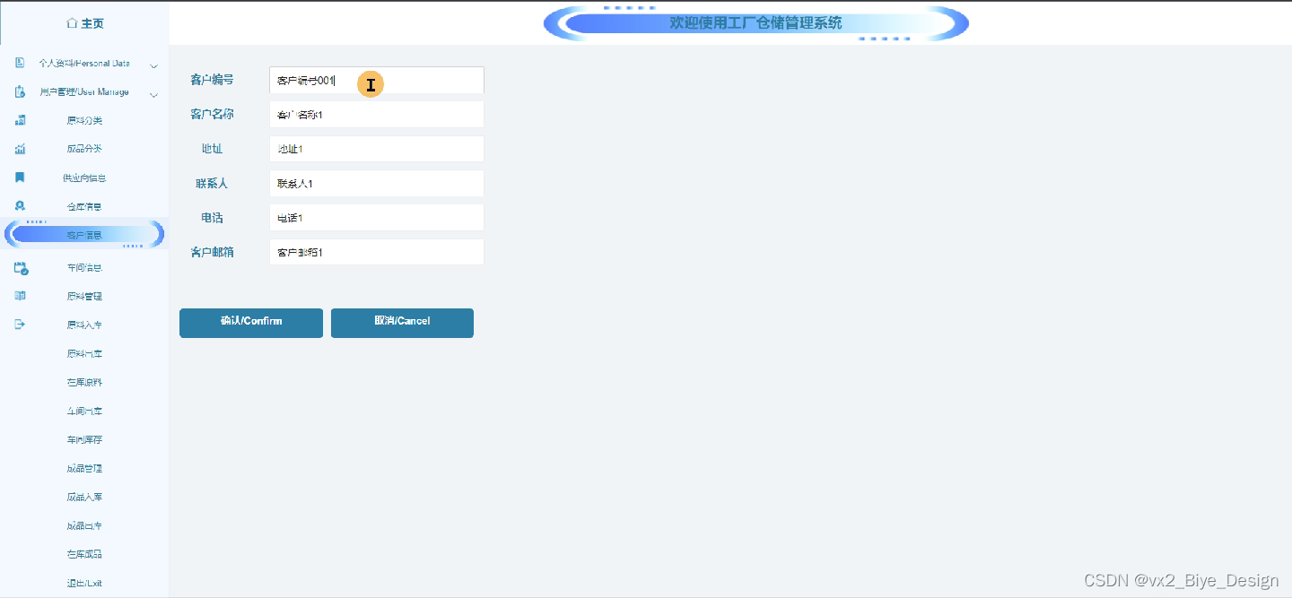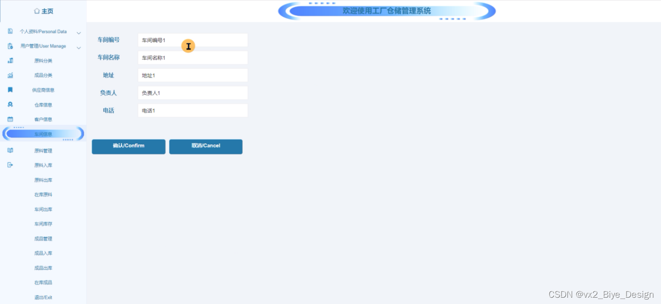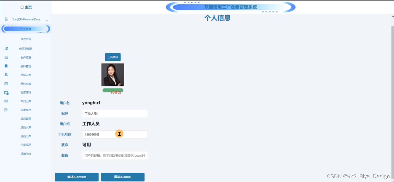 工作人员登录进入工厂仓储管理系统之后,就可以对所有的信息进行查看,可以查看到主页、个人资料、供应商信息、客户信息、原料管理、原料出库、原料入库、在库原料、车间出库、车间库存、成品管理、成品出库、成品入库、在库成品等,并且还可以对其进行相应的操作管理,如图5-11所示。