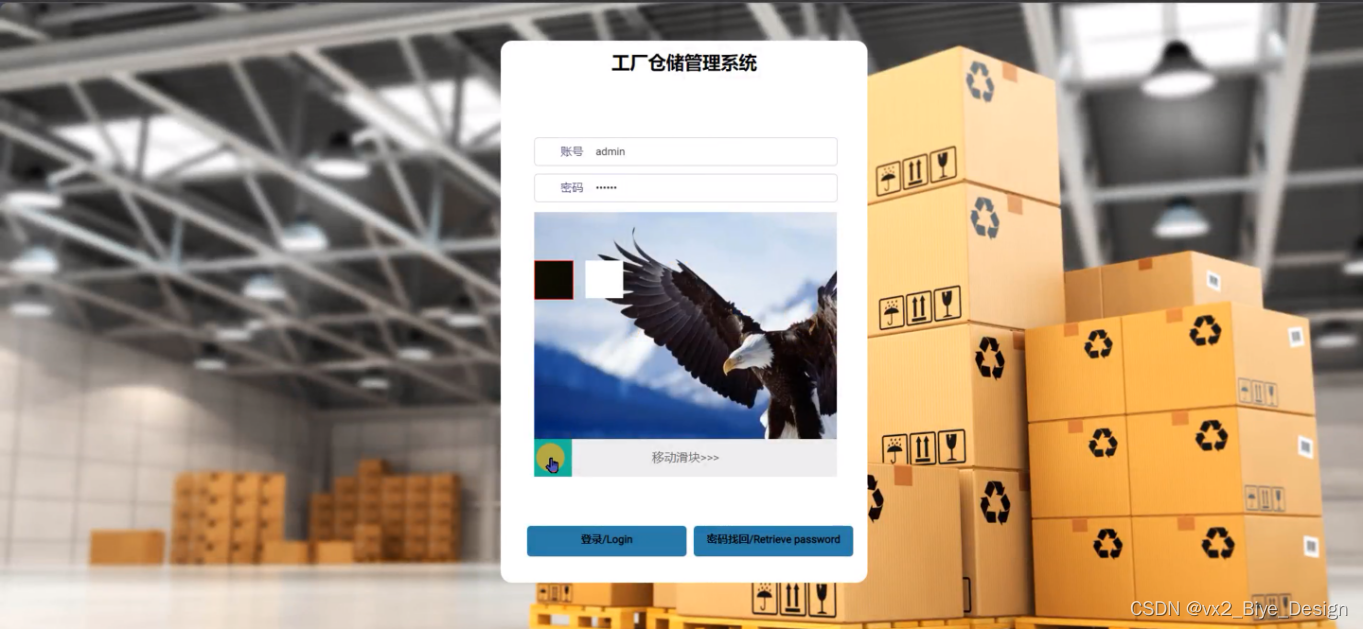 工厂仓储管理系统,在系统登录页面工作人员填写账号、密码等信息滑动滑块进行验证登录,如图5-10所示。