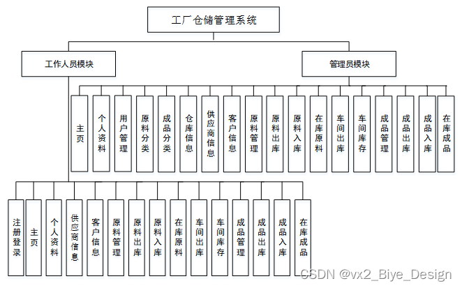 本工厂仓储管理系统主要包括两大功能模块,即管理员功能模块和用户模块。