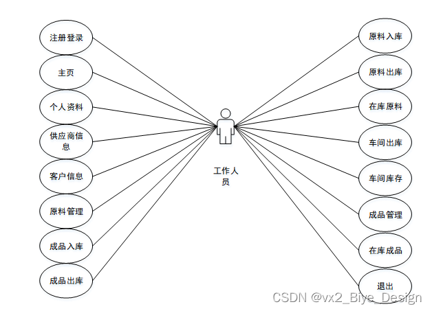 (2)工作人员:主页、个人资料、供应商信息、客户信息、原料管理、原料出库、原料入库、在库原料、车间出库、车间库存、成品管理、成品出库、成品入库、在库成品等功能。工作人员用例图如图3-2所示。