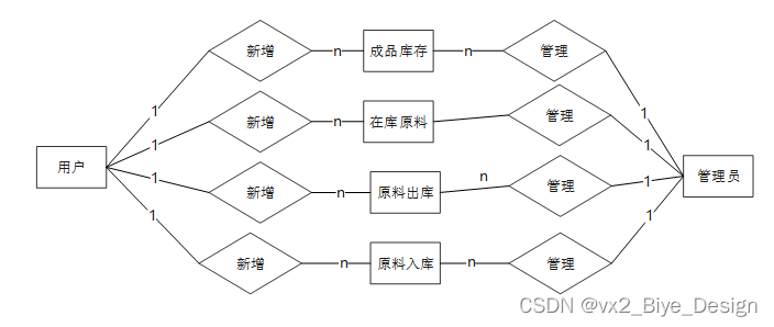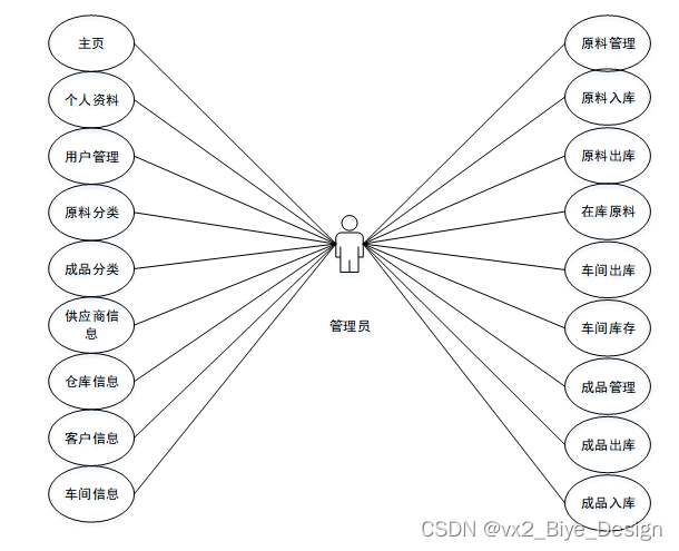 (1)管理员模块:系统中的核心用户是系统管理员,管理员登录后,通过管理员菜单来管理后台系统。主要功能有:主页、个人资料、用户管理、原料分类、成品分类、供应商信息、仓库信息、客户信息、车间信息、原料管理、原料出库、原料入库、在库原料、车间出库、车间库存、成品管理、成品出库、成品入库、在库成品等功能。管理员用例图如图3-1所示。