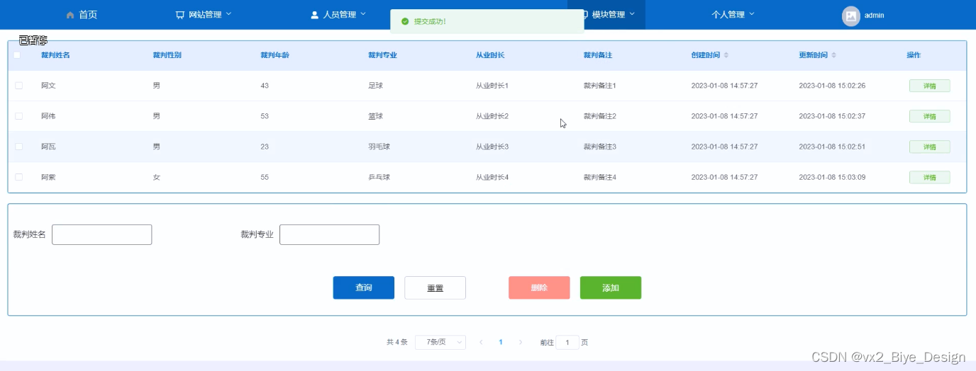 管理员执行裁判信息管理,并可以操作相关内容,例如添加,查看,编辑和删除。通过单击“添加裁判信息”,可以通过裁判信息添加界面添加详细信息。单击查看字段级别链接以查看有关所选字段级别的信息。然后单击“提交”跳转重返到添加页面。添加成功后的信息会载入到裁判信息查询列表中,管理员可进行编辑以及修改。