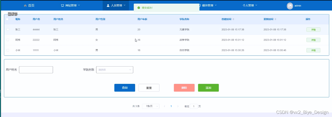 | 主事件流 | 管理员跳转用户管理页面,查询用户详情的信息 管理员可以删除用户信息 |