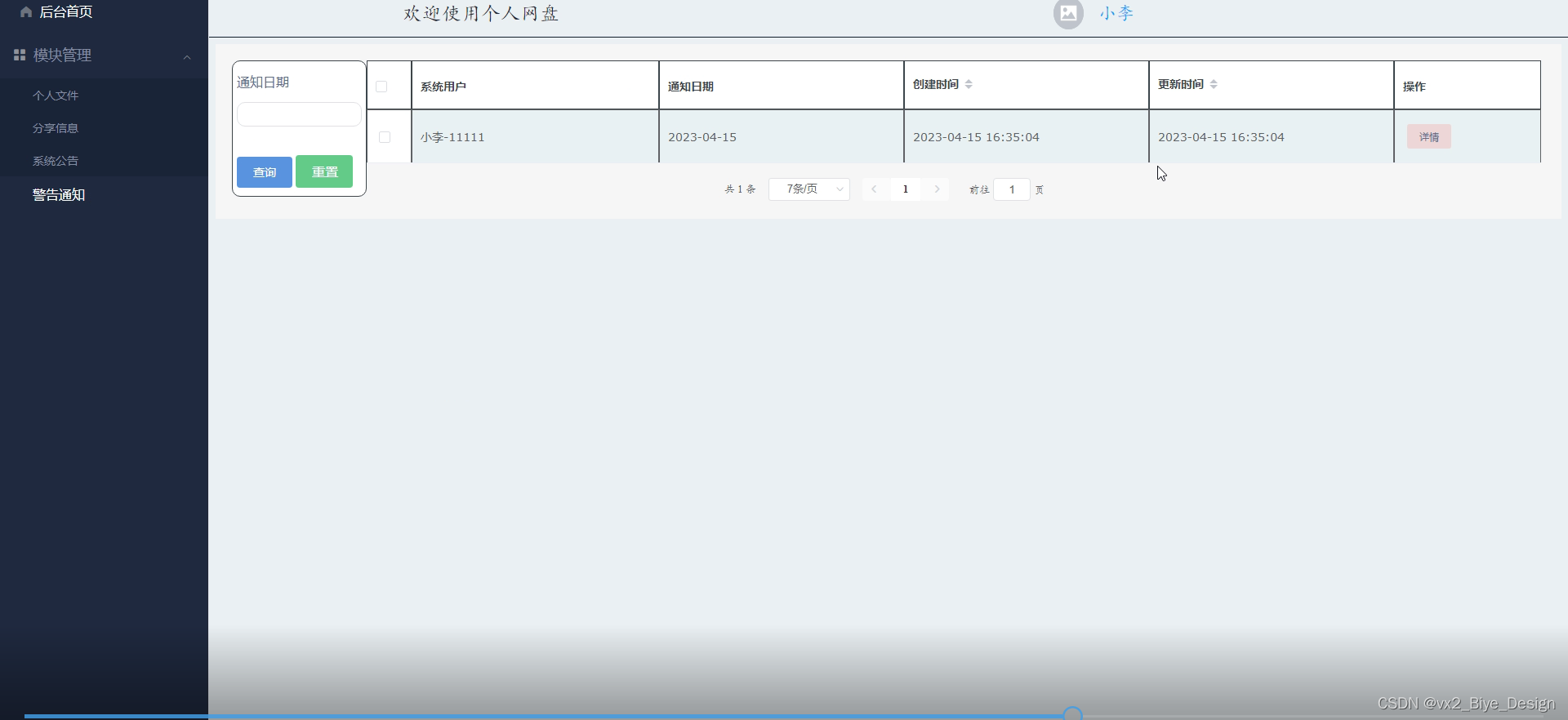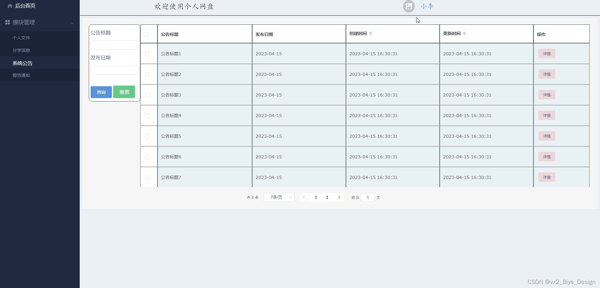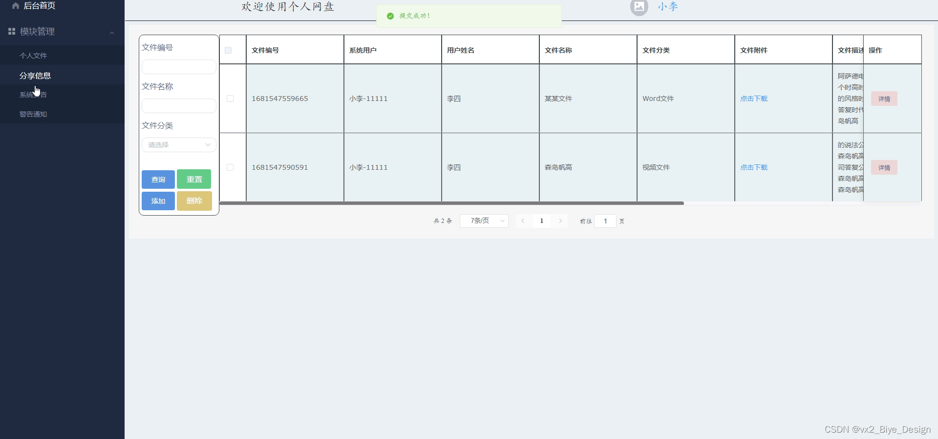 (1)功能要求:首页,文件信息、分享信息、系统公告、警告通知,修改密码,退出登录等功能模块。