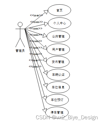 3.管理员主要负责首页、个人资料、公共管理(轮播图、公告消息)用户管理(管理员、注册用户)信息管理(汽车资讯、资讯分类)车辆认证、车位信息、车位预订、停车管理,下图所示描述管理员的用例图。